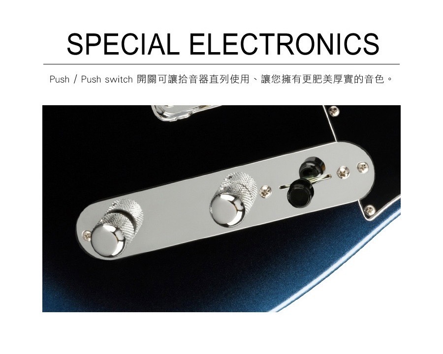 全新的 V-Mod ll Telecaster 單線圈拾音器實現了既纖細又温暖的音色,同時使用冷壓鋼板製成的兩點固定式搖座更提升了穩定度以及清晰度。