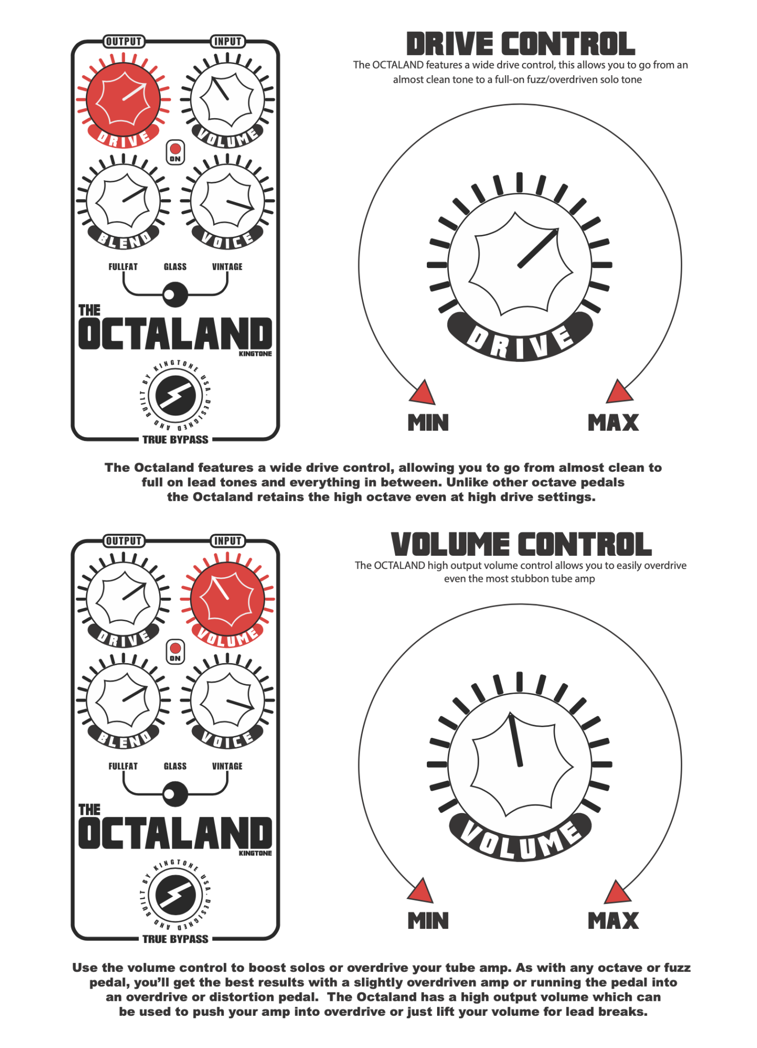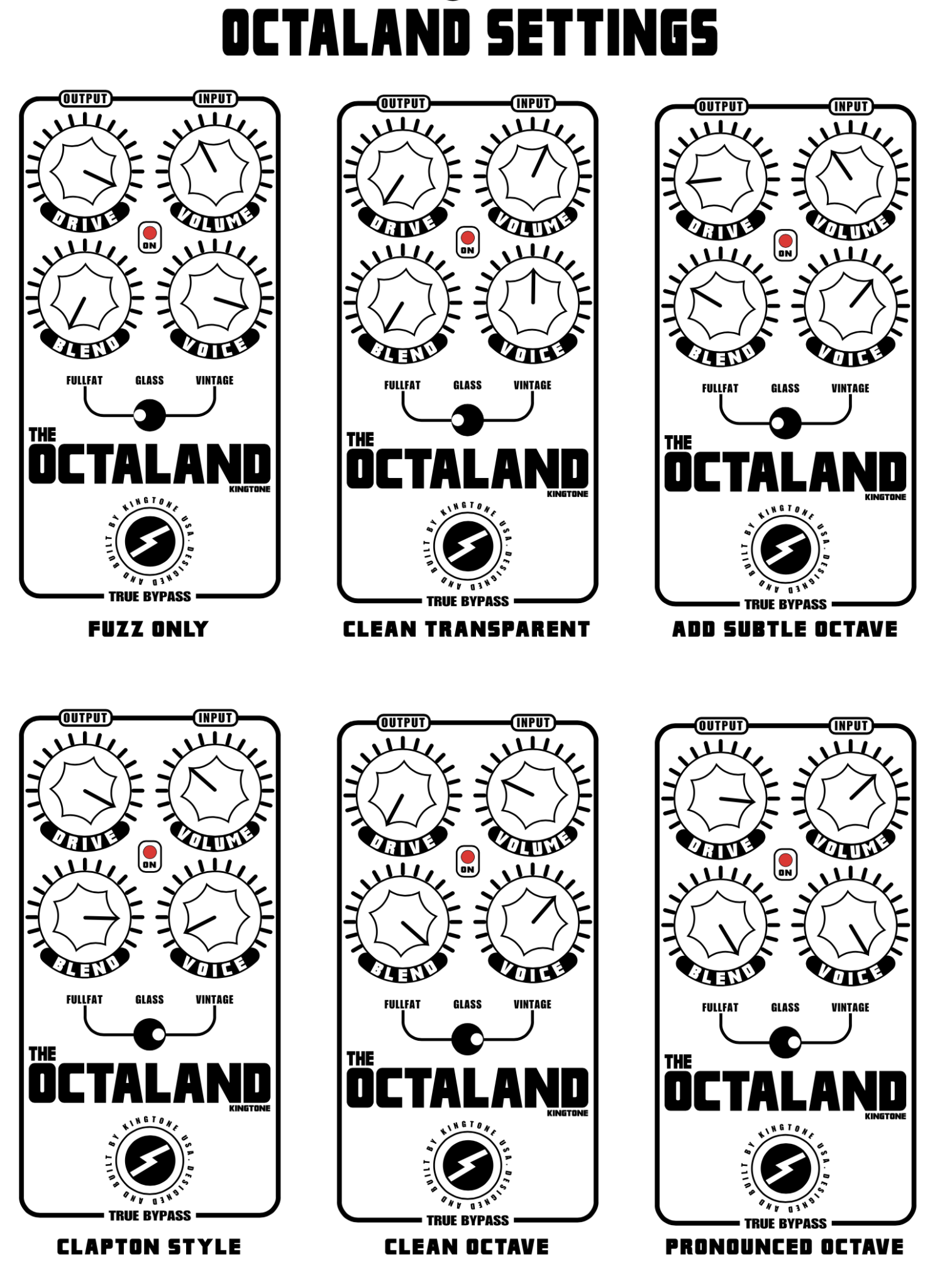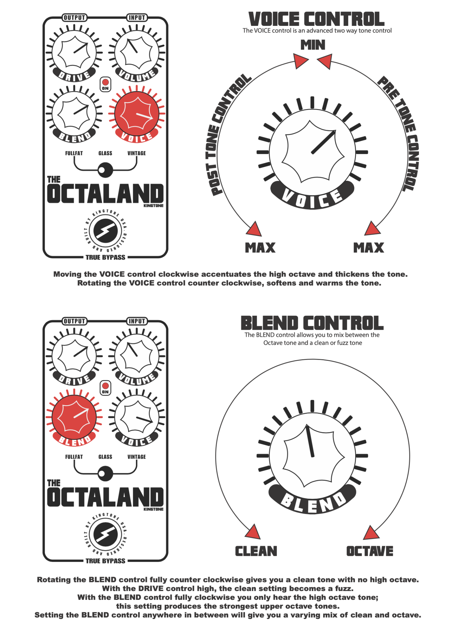 Octaland現在具有廣泛的驅動器控制功能,使您可以從幾乎乾淨的八度音調過渡到尖叫聲,維持音調以及介於兩者之間的所有音調。該混紡純八度音和一個乾淨的或模糊音之間的對照共混物。混合功能提供了許多可能性,只需在您喜歡的模糊或超速踏板上添加少量的高八度音階,即可為您的音色增加額外的質感和深度。該語音控制就像一個雙向的音調控制,當你滾吧向後它就像經典的Octaland音調控制,順時針旋轉它,它改變了踏板的清濁。語音控制為您提供了許多新的音調,而又不會失去經典的Octaland音調。Octaland還具有更多輸出,因此您可以驅動那些電子管放大器分解