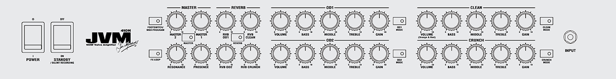 四個頻道,每個頻道具有三種增益模式,意味著 JVM 同樣擅長演奏Clean、Metal或介於兩者之間的任何東西。像是經典的乾淨頻道,前級增益模擬老式放大器。或者,在 Crunch 頻道的頂端獲得 Marshall 硬搖滾的聲音。如果你想要更重的 OD1 是完美的,而在 OD2 中,每個模式都高增益讓您的Lead Metel Tone 更延綿亮麗,在每個頻道都有三段式EQ及臨場感、共振控制鈕,你可以熟練的朔造你專屬的音調。