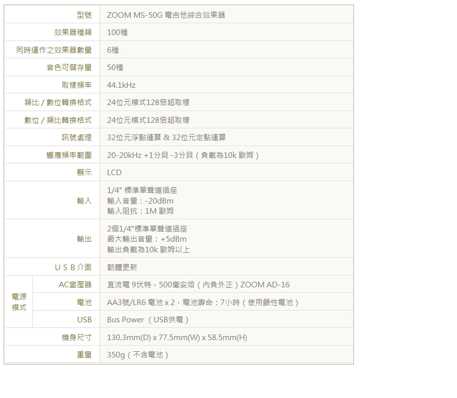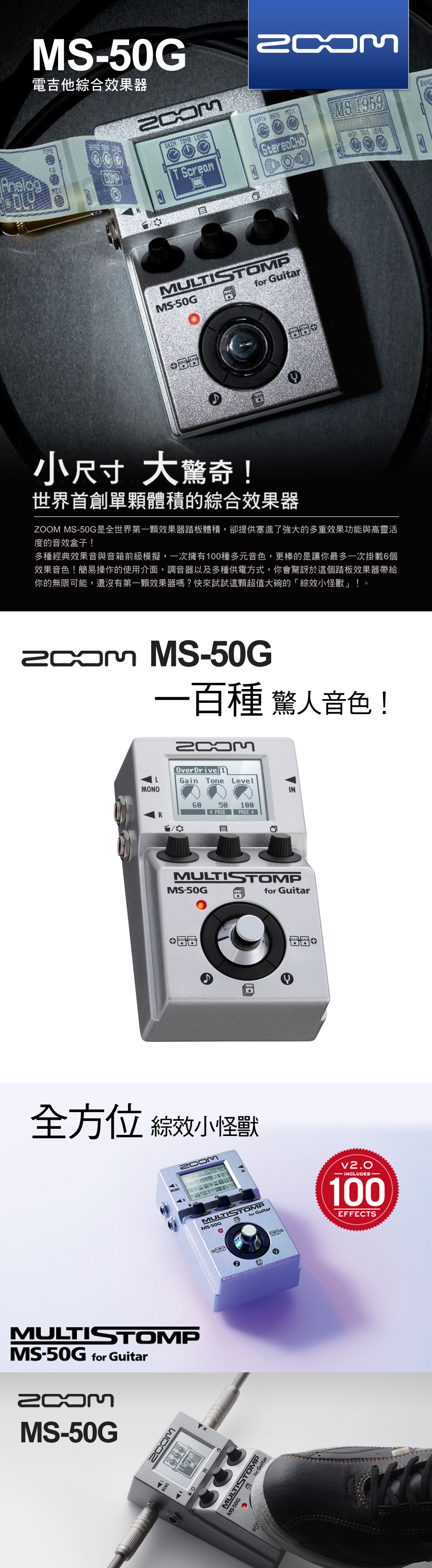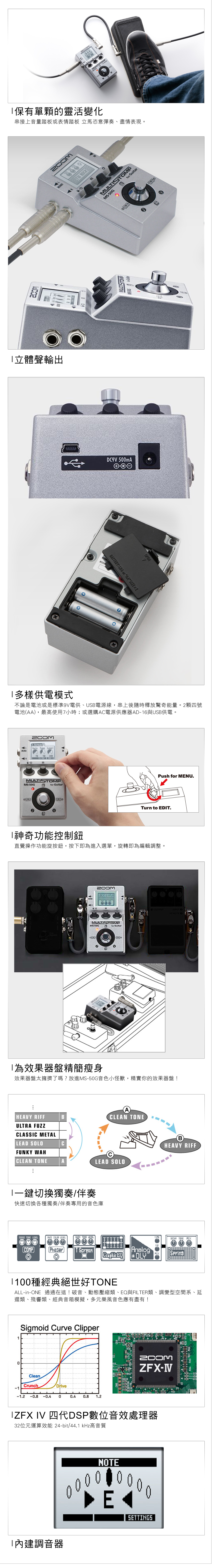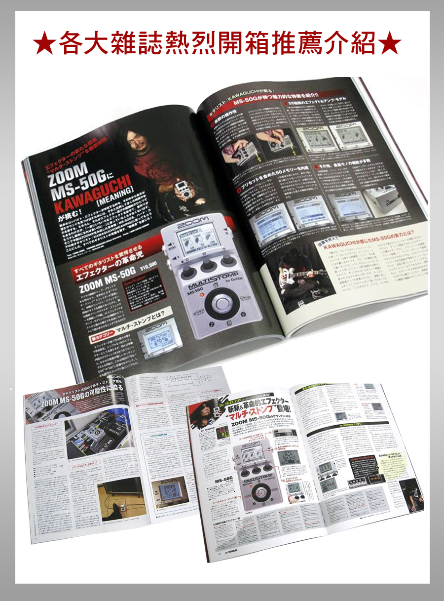 最新MS-50G,升級至172種效果器,首創單顆體積綜合效果器搭載ZFX-IV獨家晶片音效技術特製操作控制鈕,秒懂的直覺順手強大100種多重音效與音箱模擬具備自動調音功能