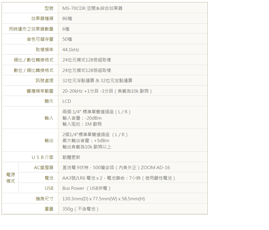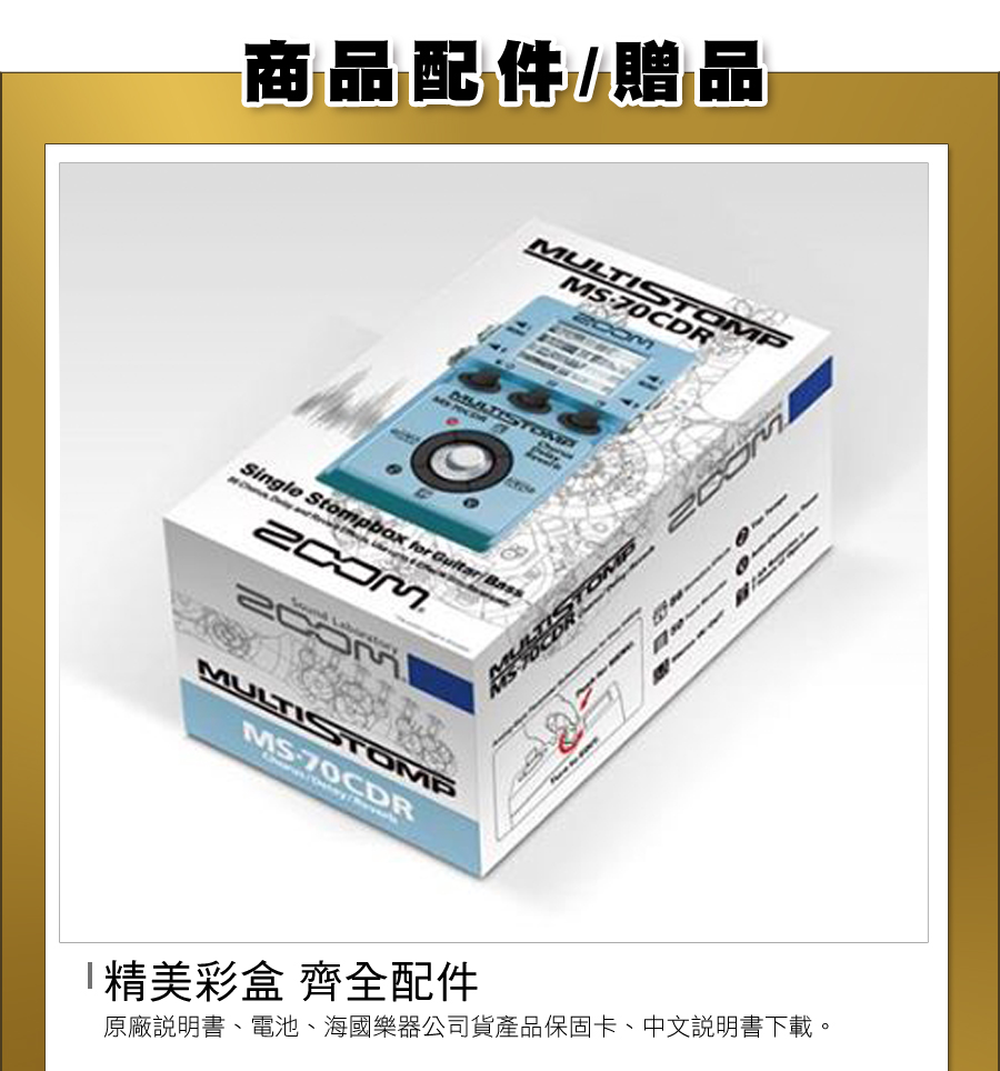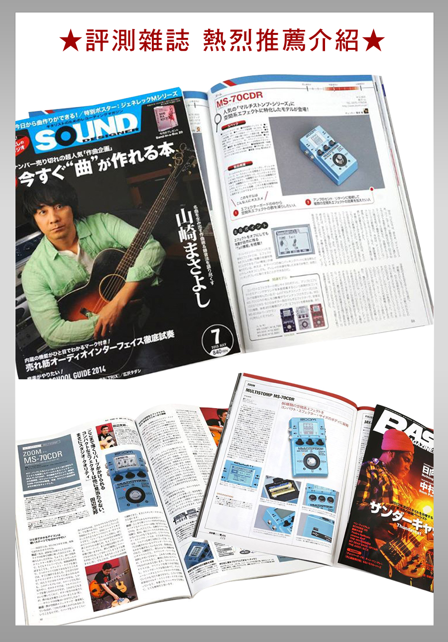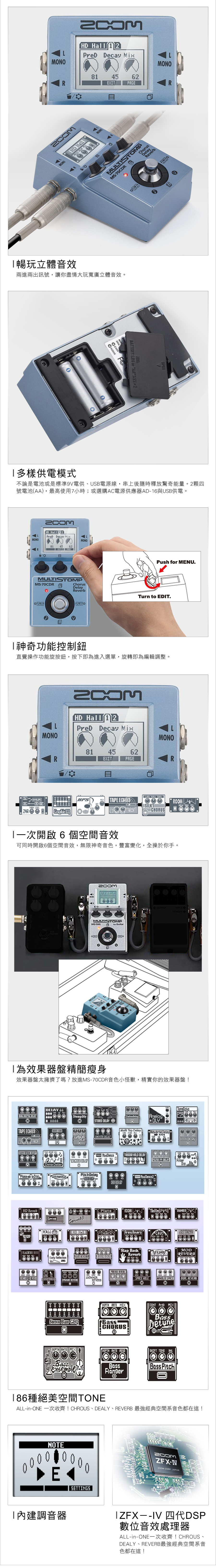 最新MS-70CDR升級至137種空間系效果器,首創單顆體積綜合效果器搭載ZFX-IV獨家晶片音效技術特製操作控制鈕,秒懂的直覺順手強大86種多重音效與音箱模擬具備自動調音功能